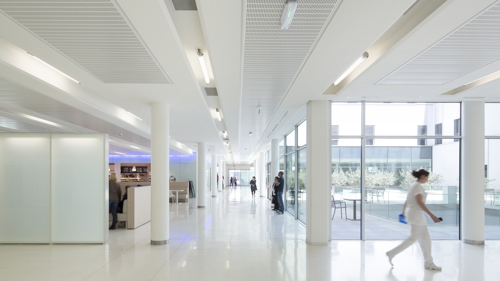 The interior spaces are entirely white, fresh, clean, with a sadly pastel nose tones of the current hospitals.