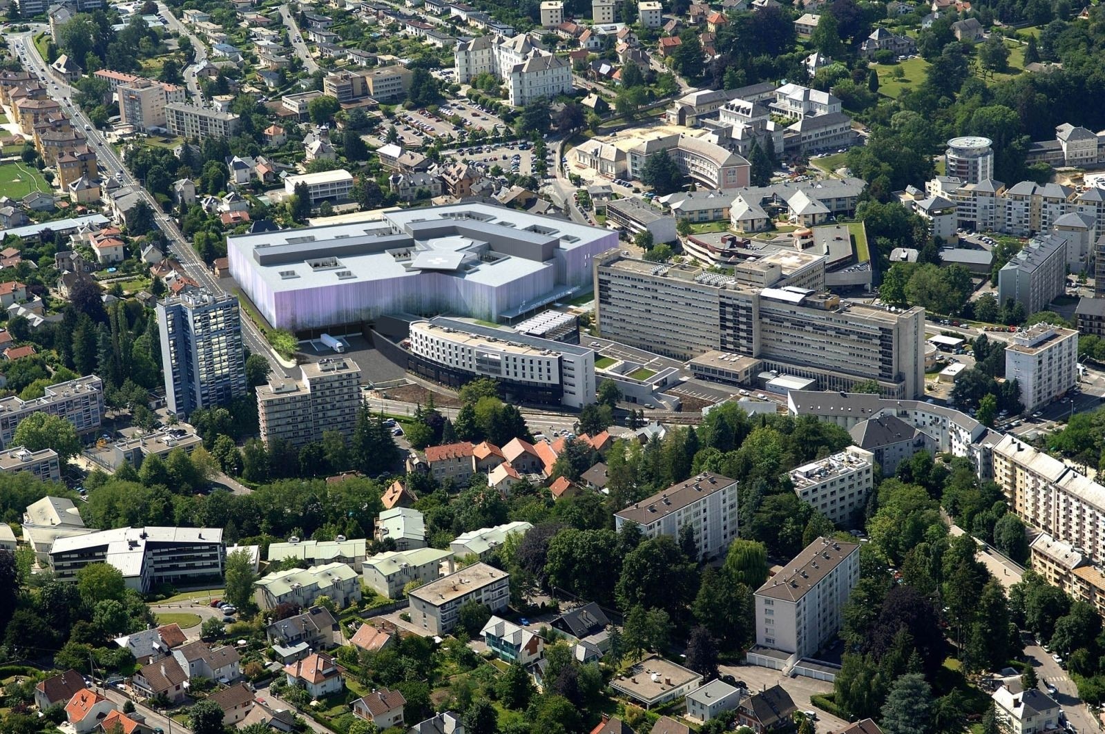 La direction de l’hôpital de Chambéry a fait un choix stratégique, important en implantant son nouvel équipement dans l’enceinte pourtant dense de son site hospitalier actuel. Il s’agissait de profiter d’une des dernières opportunités foncières occupée par l’ancienne maternité pour implanter "au chausse-pied" un bâtiment de 771 lits et places.